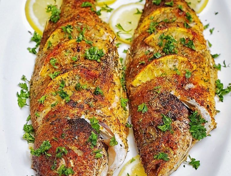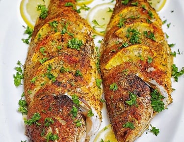 Poisson braisé, ndolé et eru préparés avec soin chaque jour.